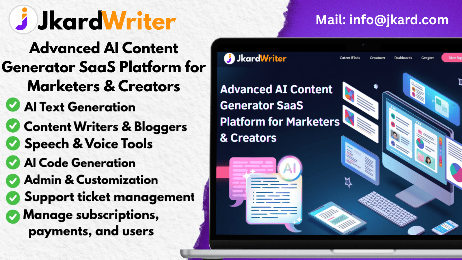 From blog posts and social media graphics to voiceovers and code snippets, JkardBot is your all-in-one creative partner. Work smarter, launch faster, and grow beyond limits.