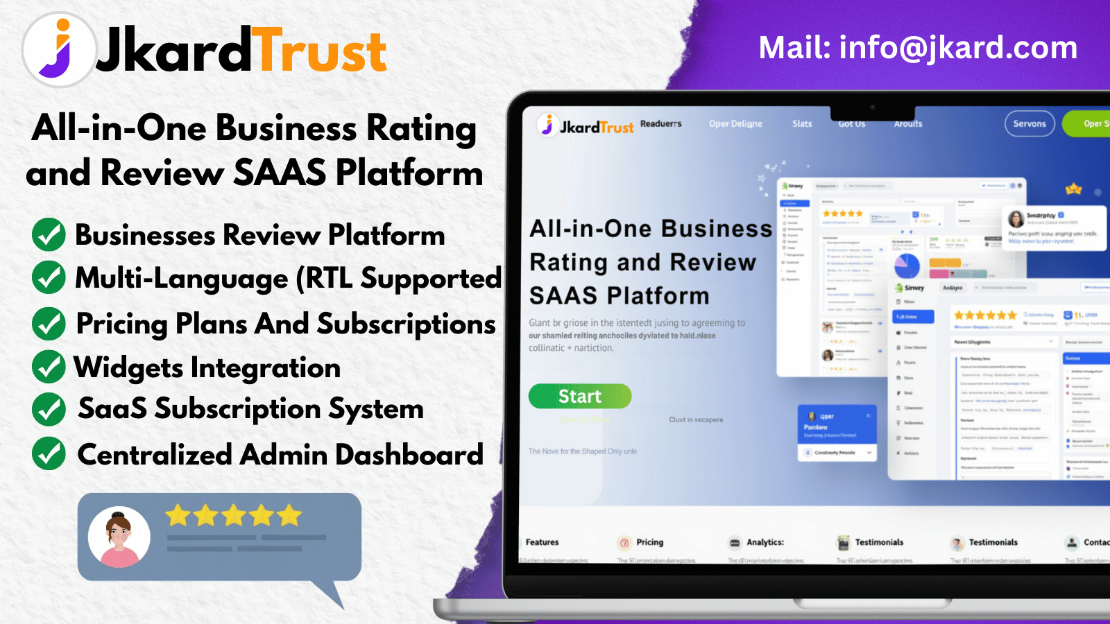 Start your SaaS business with JkardTrust, a robust review and rating platform that helps businesses collect genuine feedback, build credibility, and attract more customers.